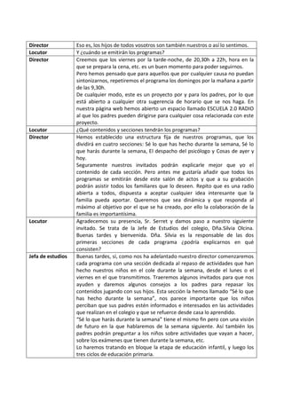 Este documento presenta el proyecto de una emisora de radio escolar llamada "Escuela 2.0" creada por un colegio para promover la colaboración entre la escuela y las familias. La emisora tendrá programas los viernes y domingos con cuatro secciones: actividades escolares de la semana, actividades escolares de la próxima semana, consejos del psicólogo escolar y entrevistas con personas mayores sobre la historia y tradiciones locales. El objetivo es mantener informadas a las familias sobre la educación de sus hijos y for