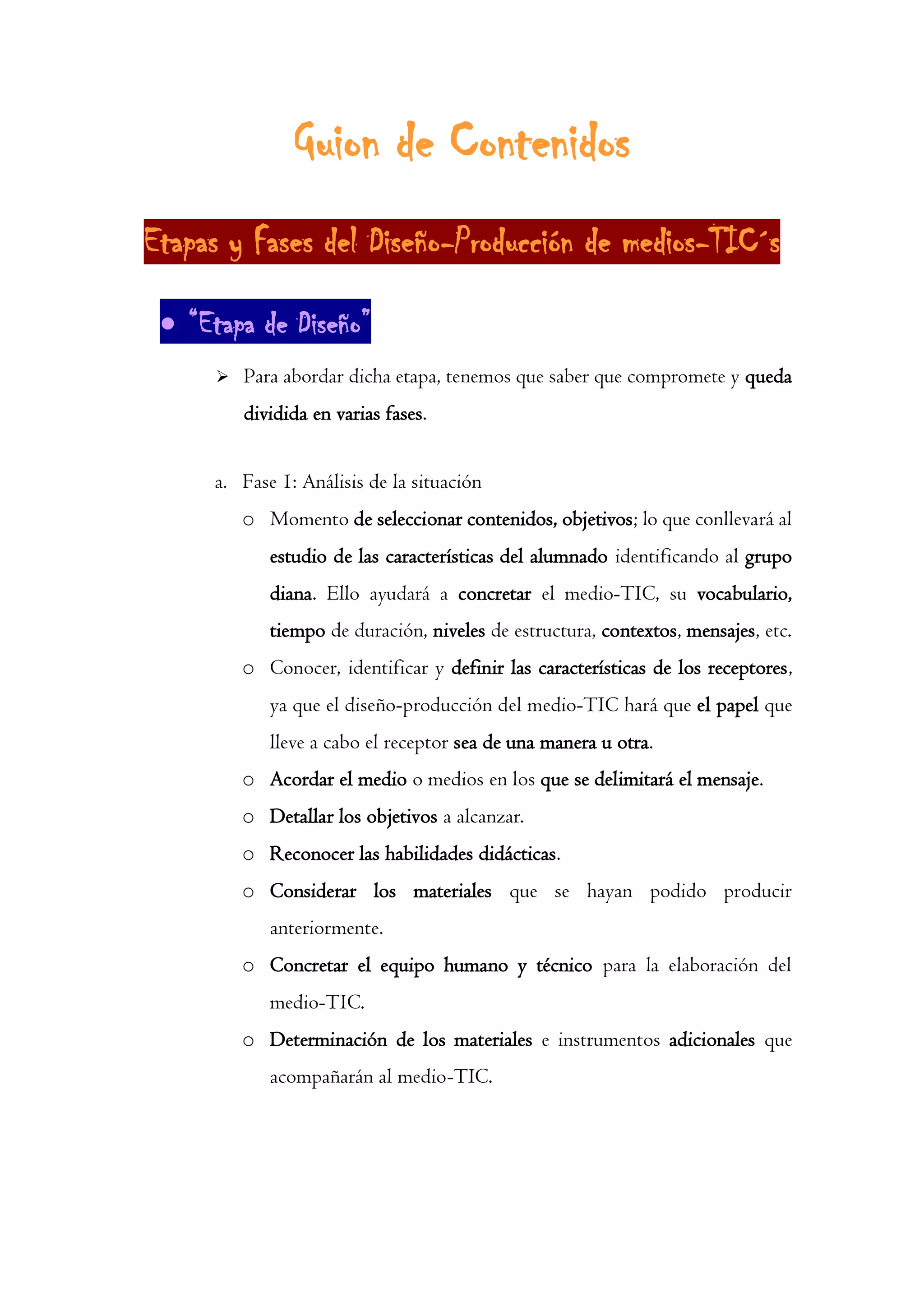 El documento describe las etapas y fases del diseño y producción de medios TIC. La etapa de diseño consta de 4 fases: 1) análisis de la situación, objetivos y características del público; 2) especificación del plan y cronograma; 3) recopilación de documentación; 4) guionización. La etapa de producción implica implementar las decisiones tomadas en el diseño. La etapa de postproducción une todo lo producido. Finalmente, la etapa de evaluación diagnostica si se alcanzaron los objetivos y registra