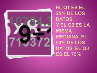 Este documento explica cómo calcular los cuartiles de un conjunto de datos ordenados. Indica que al dividir una serie de datos ordenados de menor a mayor en cuatro partes iguales, se obtienen tres cuartiles (Q1, Q2, Q3). Proporciona fórmulas para calcular la posición de cada cuartil y un ejemplo numérico para encontrar el segundo cuartil (Q2) de un conjunto de datos.
