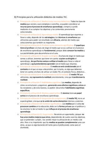 El documento presenta 11 principios para la selección de medios TIC y 11 principios para su utilización didáctica. Los principios de selección incluyen considerar los objetivos educativos, las características de los estudiantes, el contexto institucional y garantizar la calidad e interactividad de los medios. Los principios de utilización enfatizan el rol del maestro, el contexto, y el desarrollo de habilidades a través de medios que motiven la participación activa del estudiante.