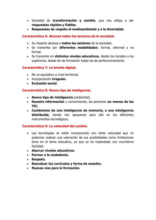 La sociedad de la información se caracteriza por ser globalizada, girar en torno a las tecnologías de la información y comunicación, y generar nuevos sectores laborales como el teletrabajo. También se ve afectada por un exceso de información, la necesidad de aprender de forma continua, la brecha digital y un nuevo tipo de inteligencia apoyado en la tecnología. Finalmente, el cambio tecnológico es muy rápido y afecta a todos los sectores de la sociedad.