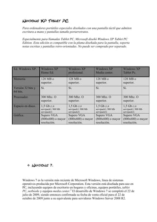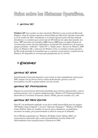 Windows XP fue el sistema operativo más utilizado del mundo. Fue lanzado en 2001 y sucesor de Windows 2000. Incluía versiones para escritorio, portátiles, tabletas y media center. Microsoft lanzó posteriormente Windows 7 en 2009 como su versión más reciente, ofreciendo ediciones Starter, Home, Professional, Enterprise y Ultimate. Ubuntu es una popular distribución Linux basada en Debian, con versiones como Kubuntu, Xubuntu y Edubuntu orientadas a diferentes entornos y usos.
