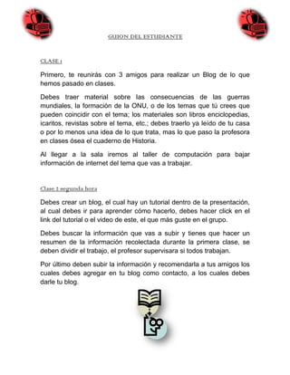 El documento presenta las instrucciones para un proyecto de blog en dos clases. En la primera clase, los estudiantes se reunirán con amigos para planificar el blog y recopilar material sobre las consecuencias de las guerras mundiales o la formación de la ONU. En la segunda clase, crearán un blog tutorial y subirán una resumen de la información recopilada, dividiendo el trabajo entre ellos. Finalmente, compartirán el blog con amigos agregados como contactos.