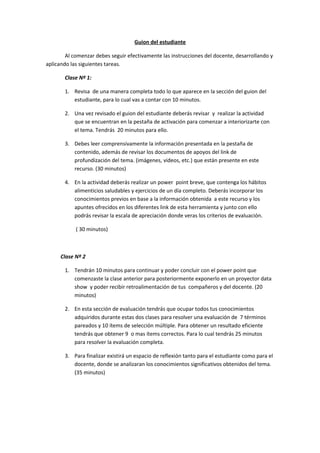 El documento presenta el guion de dos clases para los estudiantes. En la Clase 1, los estudiantes revisarán el guion, completarán actividades de aprendizaje, leerán contenido y crearán un PowerPoint sobre hábitos alimenticios y ejercicios. En la Clase 2, los estudiantes terminarán su PowerPoint, lo presentarán, completarán una evaluación de 7 términos pareados y 10 ítems de selección múltiple, y participarán en una reflexión final.