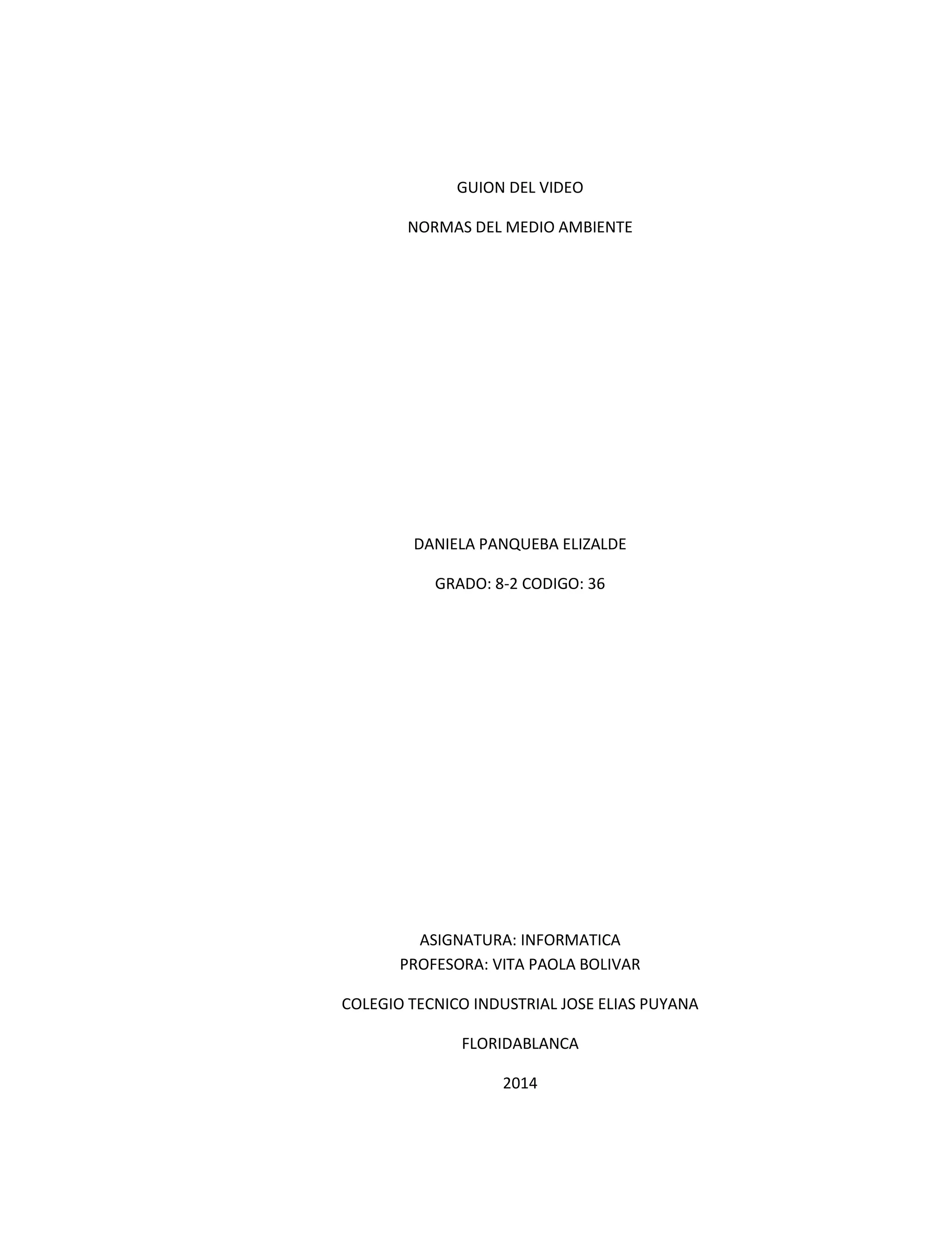 Este documento presenta el guion de un video sobre normas del medio ambiente, enfocándose en el ahorro de agua. El video entrevistará a la mamá y amigos del estudiante sobre sus hábitos de uso de agua y su percepción sobre la importancia de cuidar el agua. El estudiante concluirá que el agua es esencial para la vida y que todos debemos trabajar juntos para cuidarla y transmitir su valor a las generaciones futuras.