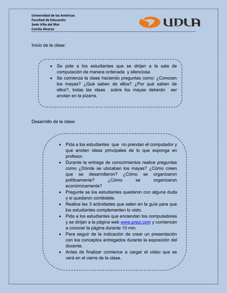 Este documento describe una lección sobre la civilización maya para estudiantes de 4o básico. La lección tiene como objetivo principal describir aspectos clave de la civilización maya como su ubicación, organización política y económica, agricultura, sociedad, religión, escritura, construcciones y vida cotidiana. La clase involucra una presentación del profesor y actividades para que los estudiantes creen una presentación en Prezi sobre los mayas.