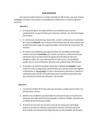 Este documento presenta un guion de dos clases de 180 minutos en total para enseñar a los estudiantes sobre un tema saludable de la alimentación y el ejercicio. La primera clase incluye actividades como calcular el índice de masa corporal, revisar contenidos y documentos de apoyo, y crear una presentación de PowerPoint sobre un día saludable. La segunda clase permite terminar la presentación, completar evaluaciones como términos pareados y selección múltiple, y reflexionar sobre lo que aprendieron.