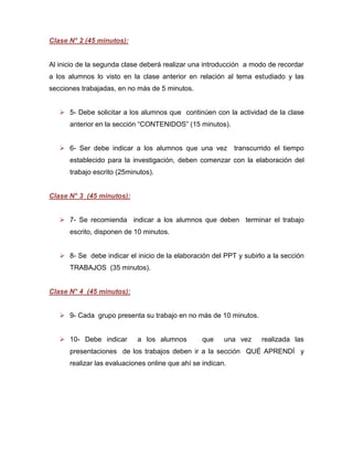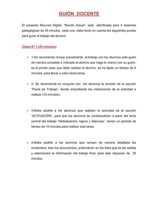 El documento presenta un guión docente para 4 sesiones de 45 minutos cada una sobre el tema "Mundo Actual". Cada sesión incluye instrucciones para los estudiantes como revisar materiales, realizar actividades de investigación y elaboración de trabajos escritos y presentaciones. El guión busca guiar a los estudiantes en la comprensión de los logros y deficiencias de la globalización a través de la lectura, discusión y producción de contenidos sobre el tema.