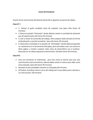 El guión del estudiante describe las actividades planeadas para dos clases. La Clase N°1 incluye 10 minutos para revisar el guión, 20 minutos para una actividad de activación, 30 minutos para leer contenidos y consultar recursos de profundización, y 30 minutos para responder un cuestionario en Educaplay. La Clase N°2 incluye 40 minutos para crear una animación en GoAnimate, 20 minutos para completar dos actividades más en Educaplay, y 30 minutos para el cierre de la clase por el profesor.