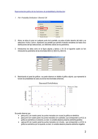Este documento describe varios modelos de distribuciones de probabilidad, incluidas las distribuciones binomial, geométrica, de Poisson y normal. Explica cómo representar gráficamente estas distribuciones y calcular probabilidades utilizando el software Statgraphics. También incluye ejemplos numéricos para ilustrar cómo modelar situaciones reales y resolver problemas utilizando estas distribuciones.
