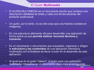 El documento describe las diferentes fases del proceso de creación de un guión multimedia, incluyendo la idea, sinopsis, presentación, storyboard y equipos de producción. Explica que el guión multimedia es un documento escrito que describe detalladamente cada escena del producto audiovisual de forma organizada e integrada con elementos visuales, de sonido y texto. El storyboard plasma de forma gráfica la estructura y contenidos para servir de guía en el desarrollo.