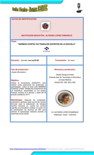 Este audio resume las normas ICONTEC para trabajos escritos en la escuela según lo enseñado a estudiantes de octavo grado. Explica los requisitos de formato como tamaño de papel, márgenes e interlineado. Luego detalla las partes de un trabajo como preliminares, cuerpo e información complementaria. Finalmente, resume cada parte con ejemplos como la portada, índice, bibliografía y más. El audio concluye recordando la importancia de aplicar estas normas para trabajos académicos y agradeciendo a la profes