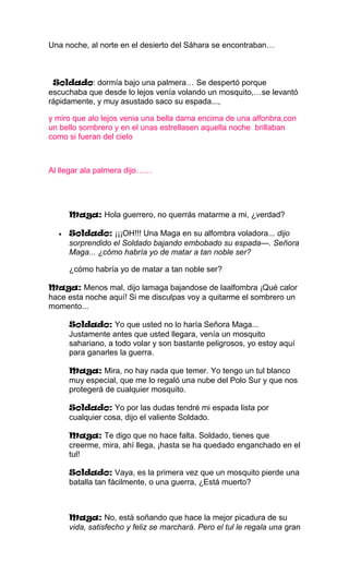 El documento presenta un guion técnico de cinco escenas que narran la historia de un soldado y una maga cuentacuentos que se encuentran en una colina. Deciden contarse cuentos para combatir el calor, y el soldado le cuenta al maga sobre sus aventuras en el desierto del Sahara. Luego viajan en la alfombra mágica de la maga a Australia, donde el soldado le muestra canguros y tienen una carrera. Finalmente, acuerdan que es divertido contar historias y la maga promete enseñarle