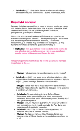 El guion técnico describe escénicamente las escenas de una historia a través de planos de cámara, volumen de voz de los actores, y duración. La historia presentada involucra a un soldado y una maga que pasan el rato en una colina y deciden contarse historias el uno al otro, con el soldado contando primero sobre un encuentro suyo con la maga en el desierto del Sahara.