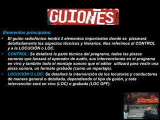 El documento define un guión como la guía ordenada para desarrollar un programa de radio, televisión u otra producción. Explica que un guión radiofónico detalla el desarrollo técnico y literario de un programa de radio. Los elementos principales son el control, con las intervenciones técnicas, y la locución, con el texto de los locutores. Existen dos modelos de guión, el estadounidense de una columna y el europeo de dos columnas. También hay cuatro tipos de guión como la escaleta, guión literario, técn