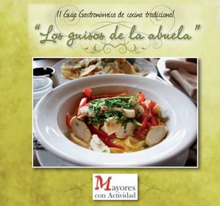 Este documento presenta una guía gastronómica de cocina tradicional de Cartagena y su comarca. Incluye una introducción sobre la importancia de preservar las costumbres culinarias locales y una serie de recetas típicas aportadas por mayores de la región, con el objetivo de conservar y difundir su rica herencia gastronómica. El documento finaliza agradeciendo a los mayores su esfuerzo por compartir sus conocimientos culinarios a través de esta guía.