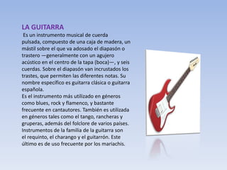 La guitarra es un instrumento musical de cuerda pulsada compuesto de una caja de madera, un mástil con un diapasón que tiene trastes para diferentes notas, y seis cuerdas. Es el instrumento más utilizado en géneros como blues, rock y flamenco, y también se usa en estilos como el tango, rancheras y música folclórica. Instrumentos relacionados incluyen el requinto, charango y guitarrón.