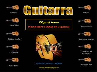 Guitarra Amapola Amoramor Besame mucho La paloma Perfidia Quizas quizas Maria Elena Solamente una vez La sombra de tu sonrisa Vaya con Dios Musique d’accueil : Nuages Elige el tema Pincha sobre el dibujo de la guitarra [email_address]