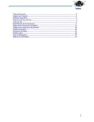Este documento presenta el proyecto de un sistema de venta de instrumentos musicales llamado "Guitar's House". Describe seis casos de uso principales como ingresar al sistema, registrar ventas, ingresar nueva información, modificar información, cambiar contraseña y consultar información. También incluye especificaciones detalladas de los escenarios para cada caso de uso.