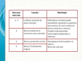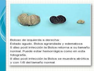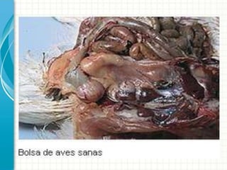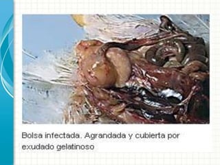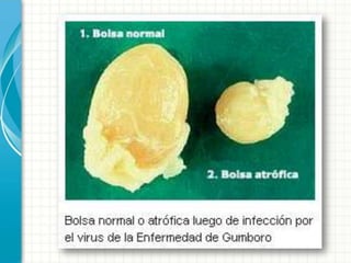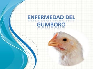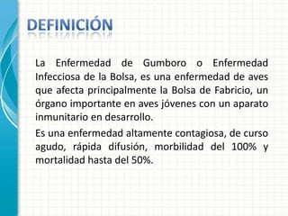 La Enfermedad de Gumboro es una enfermedad altamente contagiosa que afecta principalmente a las aves jóvenes, causando una infección aguda de la Bolsa de Fabricio con síntomas como depresión, anorexia y diarrea, lo que puede resultar en una mortalidad de hasta el 50%. El virus de la enfermedad causa una inmunodepresión que deja a las aves susceptibles a infecciones secundarias.