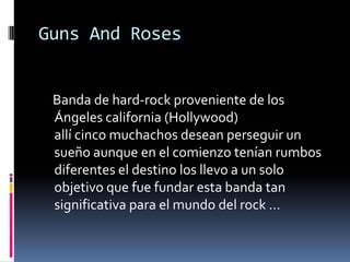 Guns N' Roses se formó en Los Ángeles por cinco jóvenes con la ambición de perseguir sus sueños musicales. La alineación original incluyó al líder y fundador Axl Rose, los guitarristas Izzy Stradlin y Slash, el bajista Duff McKagan y el baterista Steven Adler. Aunque la alineación cambió inicialmente, estos cinco músicos lograron establecer la banda como una de las más influyentes del hard rock.