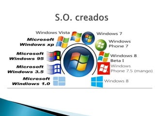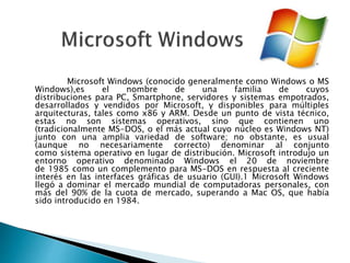 El documento habla sobre el sistema operativo Microsoft Windows. Explica que Windows fue introducido por Microsoft en 1985 como un complemento de MS-DOS para responder al creciente interés en las interfaces gráficas de usuario. Microsoft Windows llegó a dominar el mercado mundial de computadoras personales con más del 90% de cuota de mercado, superando a Mac OS. El documento también enumera algunos comandos utilizados en el Panel de control de Windows.