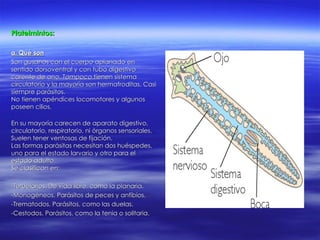 Este documento resume las características de tres filos de animales conocidos como gusanos: platelmintos, nematodos y anélidos. Los platelmintos son parásitos aplanados sin sistema digestivo ni circulatorio. Los nematodos son "gusanos redondos" microscópicos con digestión extracelular. Los anélidos son gusanos segmentados con digestión y sistema excretor completos.