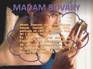 Este documento resume la obra literaria "Madame Bovary" de Gustave Flaubert. Es una novela publicada en 1857 que trata temas como la infidelidad, el remordimiento y la frustración del personaje principal Emma Bovary al no encontrar el amor romántico que buscaba en su matrimonio con Charles Bovary. La obra se enmarca en el género narrativo y corriente literaria de la novela.