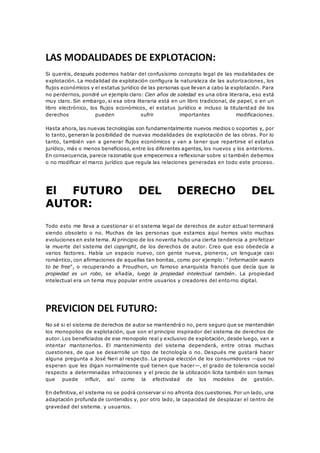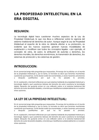 El documento discute cómo la tecnología digital está cuestionando la ley de propiedad intelectual y los derechos de autor tradicionales. Específicamente, los nuevos soportes digitales están generando nuevas formas de explotación de obras que modifican conceptos legales como la obra, el autor y los derechos asociados. Esto lleva a preguntarse si el sistema actual necesita ser modificado o reemplazado para adaptarse a la era digital.