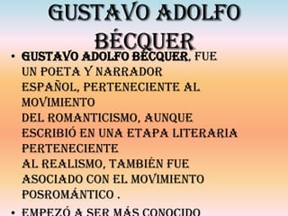 Gustavo Adolfo Bécquer fue un poeta y narrador español del siglo XIX perteneciente al movimiento romántico. Escribió las Rimas, poemas breves sobre el amor y el desamor, y las Leyendas, relatos cortos de temática fantástica e histórica. Sus obras se caracterizan por lo subjetivo, lo sentimental y la fusión de lo histórico con lo legendario.