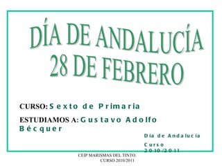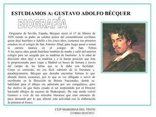 El documento proporciona información biográfica sobre el escritor español Gustavo Adolfo Bécquer. Detalla que nació en Sevilla en 1836 y quedó huérfano a una edad temprana. Se mudó a Madrid para perseguir una carrera literaria que resultó difícil al principio. Más tarde encontró trabajo como editor y escribió la mayoría de sus famosas rimas y leyendas. Falleció en 1870 a la edad de 34 años.