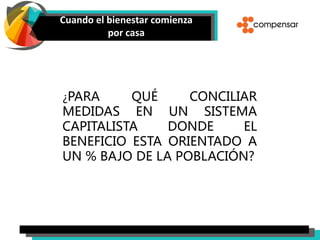 El documento describe los esfuerzos de una organización sin ánimo de lucro llamada Compensar para mejorar el bienestar de sus empleados a través de programas de capacitación, flexibilidad laboral, servicios de apoyo y políticas de igualdad de oportunidades. Compensar ha establecido una universidad corporativa llamada Prisma que ofrece cursos y capacitación continua para promover el desarrollo profesional de los empleados. Las investigaciones realizadas por Prisma buscan mejorar continuamente los programas de capacitación y el liderazgo dentro