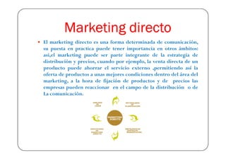 Este documento trata sobre el marketing directo. Explica que el marketing directo es una forma de comunicación directa con los clientes que permite a las empresas ofrecer productos y servicios de manera personalizada. También describe algunas ventajas del marketing directo como ganar clientes leales y concentrar esfuerzos en mercados específicos. Finalmente, concluye que el marketing directo centra las acciones de marketing en el individuo y que su crecimiento indica un cambio hacia relaciones más personalizadas entre empresas y clientes a nivel global.