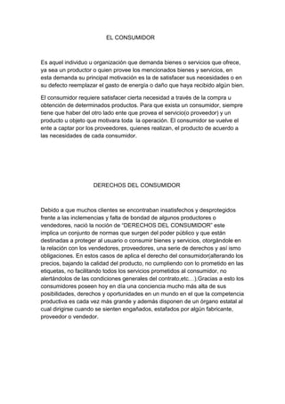 Este documento describe el comportamiento del consumidor, incluyendo sus motivaciones y hábitos de compra. Define al consumidor como un individuo u organización que demanda bienes o servicios para satisfacer necesidades. Explica que los consumidores tienen derechos protegidos por leyes y que sus comportamientos de compra se ven influenciados por factores como qué, cuándo, dónde y cómo compran, así como por motivos racionales, emocionales y de selección. Finalmente, señala que los hábitos de compra incluyen la elección del establec