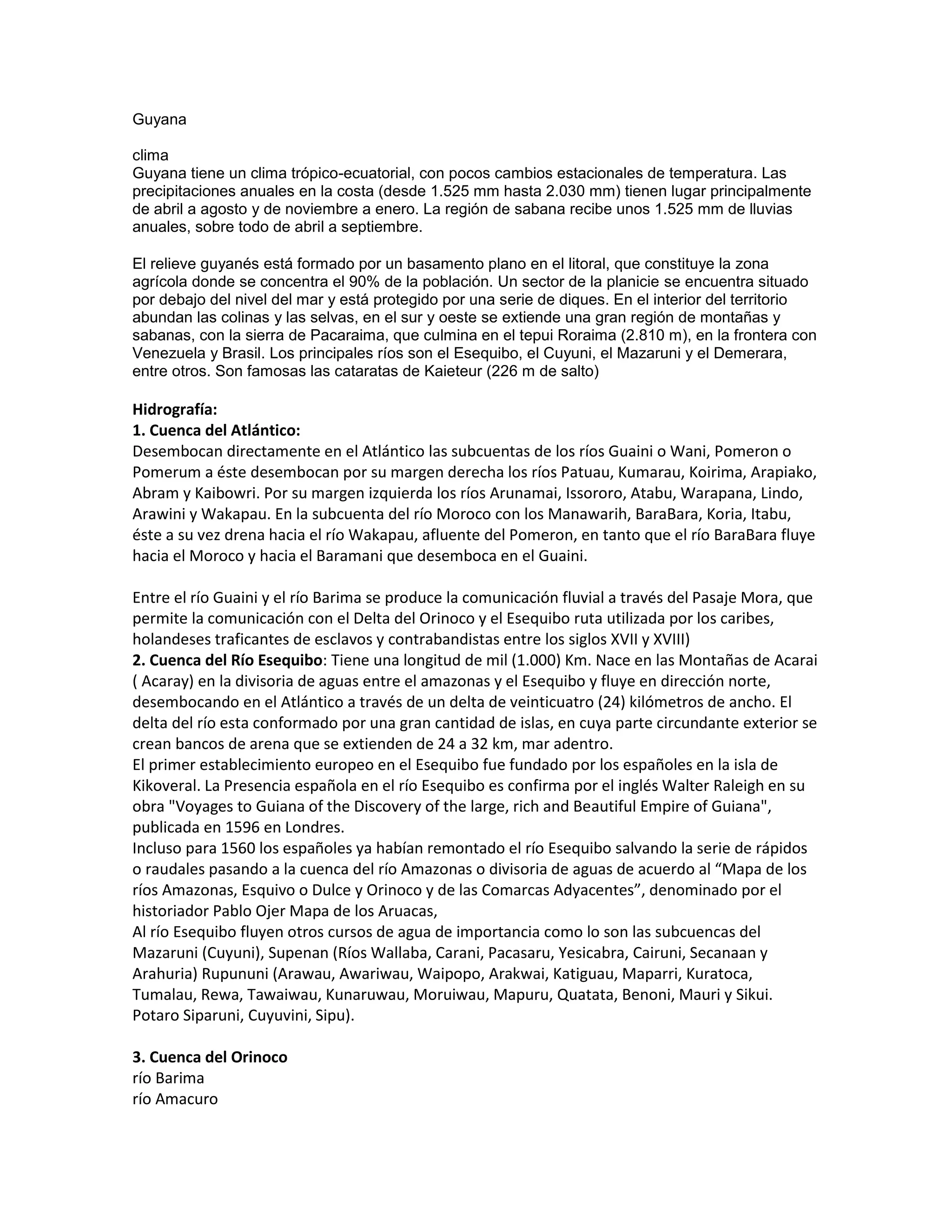 Guyana tiene un clima tropical con lluvias anuales entre 1.525 y 2.030 mm. El relieve está formado por una planicie costera donde vive el 90% de la población y por colinas e interior selvado, incluyendo la cordillera Pacaraima con el pico más alto, el Monte Roraima de 2.810 m. Los principales ríos son el Esequibo, Cuyuni y Mazaruni. La economía se basa principalmente en la agricultura, pesca y minería de bauxita.