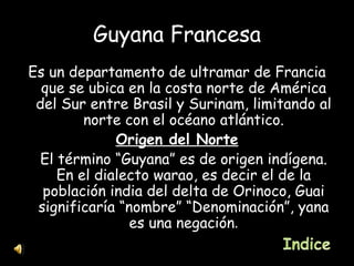 La Guyana Francesa es un departamento de ultramar de Francia ubicado en la costa norte de Sudamérica. Fue colonizada por Francia en 1604 y ha tenido una historia de colonización, esclavitud y relegación de convictos. Actualmente tiene una población multiétnica de alrededor de 191,000 habitantes y su economía depende en parte de la agencia espacial europea y la industria forestal.