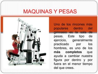 Este documento describe los diferentes servicios y actividades de entrenamiento ofrecidos en un gimnasio, incluyendo máquinas y pesas, cardio, abdominales, aeróbica, step, kick boxing, bailoterapia, functional training y spinning. Cada actividad trabaja diferentes áreas del cuerpo y proporciona beneficios como mejorar la figura, endurecer los músculos, quemar grasa y fortalecer el corazón.