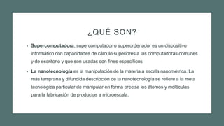 Los superordenadores y la nanotecnología son tecnologías avanzadas. Los superordenadores tienen una capacidad de cálculo superior y se usan para modelar aerodinámica, proteínas y enfermedades. La nanotecnología manipula la materia a escala nanométrica y se aplica en electrónica, energía, biomedicina y otros campos. Los superordenadores más potentes del mundo incluyen Summit, Sierra y Tianhe-2A. En España, el superordenador más potente es MareNostrum en el Barcelona Supercomputer Center.