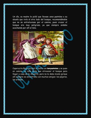 La historia cuenta que Caperucita Roja lleva una cesta con pasteles a casa de su abuela a través del bosque, donde se encuentra con un lobo. El lobo engaña a la abuela y se la come. Luego espera a Caperucita disfrazado de la abuela y también se la come. Un cazador había observado al lobo y logra rescatar a Caperucita y su abuela cortando el vientre del lobo mientras duerme. Para castigarlo, le llena el vientre de piedras, haciendo que se