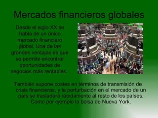El documento discute los beneficios y costos de la integración financiera y monetaria entre países. La integración financiera crea un mercado global pero también propaga las crisis financieras. La integración monetaria, como la adopción del euro en la UE, elimina las incertidumbres del tipo de cambio pero reduce la soberanía monetaria. Para que una unión monetaria sea óptima, los países deben tener vías para corregir desequilibrios como la movilidad laboral o políticas fiscales coordinadas.