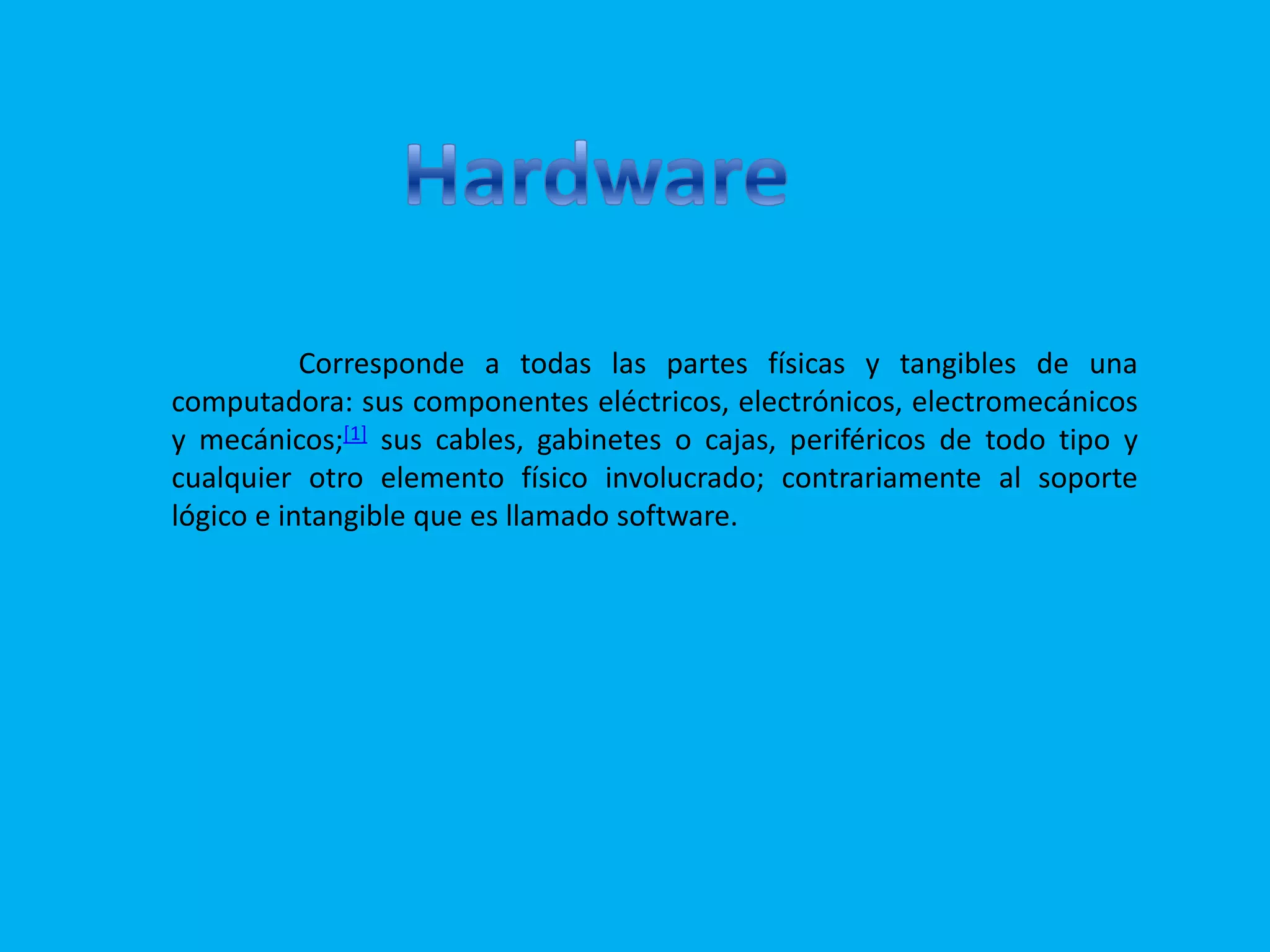 El hardware de una computadora incluye todas las partes físicas como componentes eléctricos, electrónicos y mecánicos, cables y gabinetes. El hardware básico incluye componentes indispensables como la CPU y memoria, mientras que el hardware complementario incluye periféricos para funciones específicas. Todo sistema informático tiene hardware dedicado a funciones de procesamiento, almacenamiento, entrada, salida y entrada/salida.