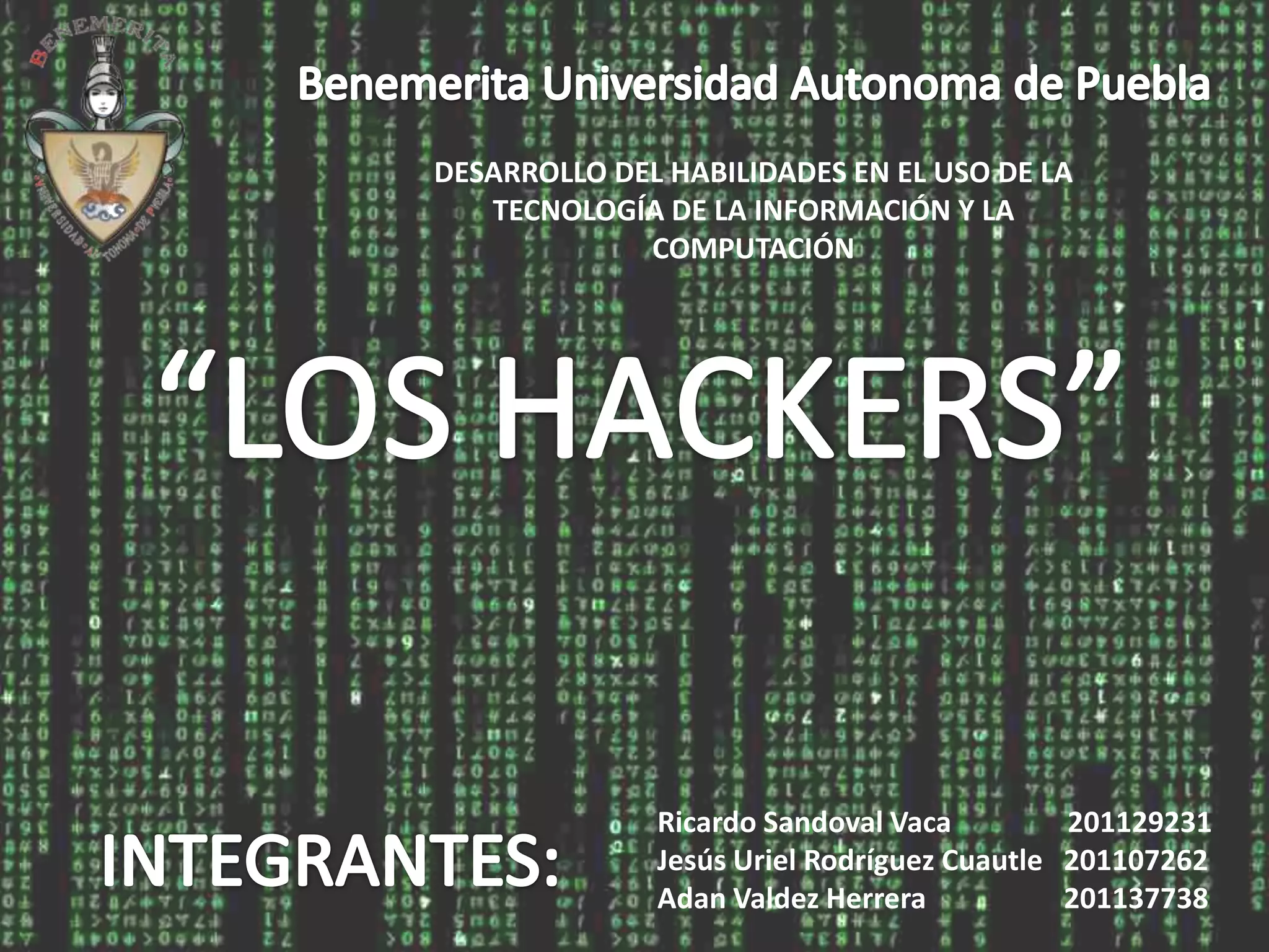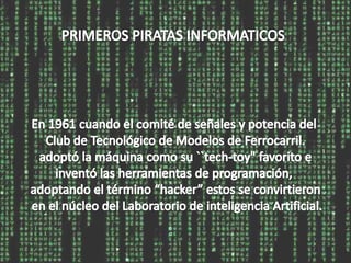 El documento habla sobre el desarrollo de las habilidades en el uso de la tecnología de la información y la computación. Explica los orígenes de los primeros piratas informáticos y hackers, así como algunos de los hackers más importantes en la historia. Define términos clave como hacker, cracker, lammer y samurai. También discute los códigos de ética y el impacto de la tecnología en la sociedad moderna.