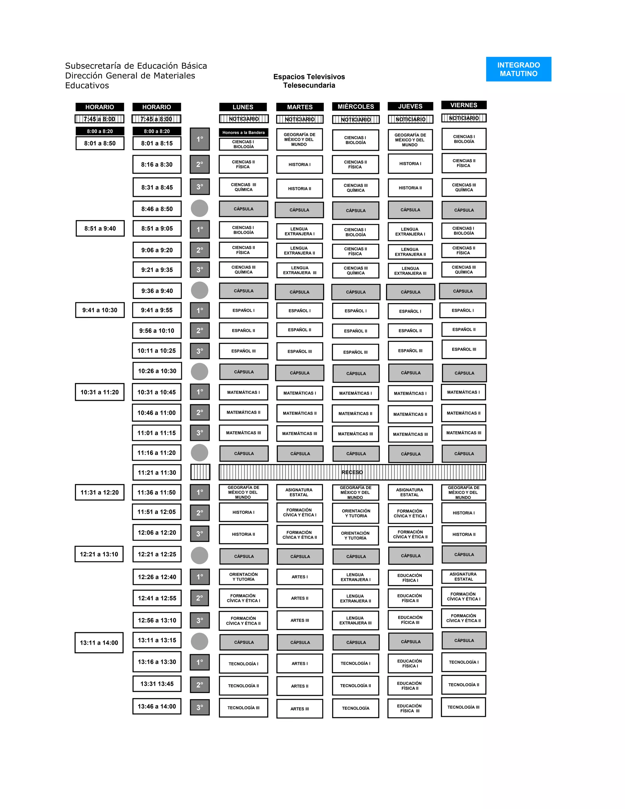 Este documento presenta el horario de clases de la Telesecundaria dividido en sesiones matutinas y vespertinas. En las mañanas, los estudiantes de 1o, 2o y 3er grado reciben clases de ciencias, lenguas extranjeras, español, matemáticas, geografía e historia. Por la tarde, las clases incluyen asignaturas estatales, formación cívica y ética, artes, tecnología y educación física.