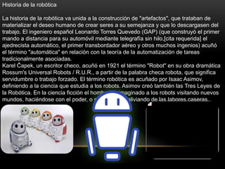 El documento habla sobre la historia de la robótica. Explica que la palabra "robot" fue acuñada en 1921 por el escritor checo Karel Čapek. Luego, Isaac Asimov acuñó el término "robótica" y creó las Tres Leyes de la Robótica. Las tres leyes establecen que un robot no puede dañar a un humano, debe obedecer órdenes humanas excepto si van en contra de la primera ley, y debe proteger su propia existencia siempre que no vaya en contra de la primera o segunda ley