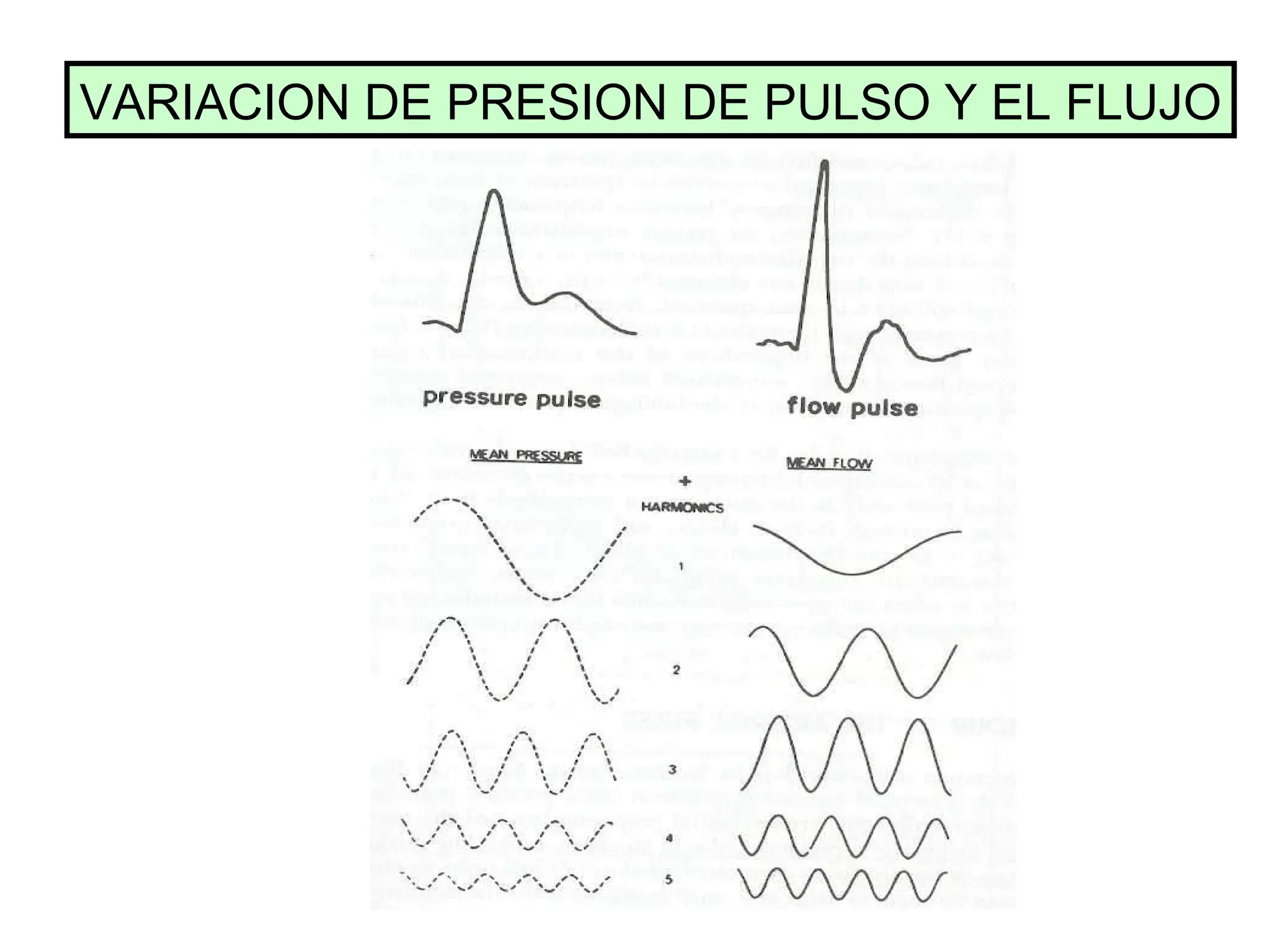 El documento trata diversos temas relacionados con la circulación sanguínea, incluyendo la variación de la presión de pulso y el flujo en relación con la viscosidad y el diámetro del vaso, la relación entre el hematocrito y el diámetro vascular, y los cambios en la onda de presión y flujo. También discute conceptos como el flujo laminar vs turbulento, la capacitancia arterial y venosa, y factores que afectan la presión arterial como la viscosidad, frecuencia cardíaca y distensibilidad vascular.