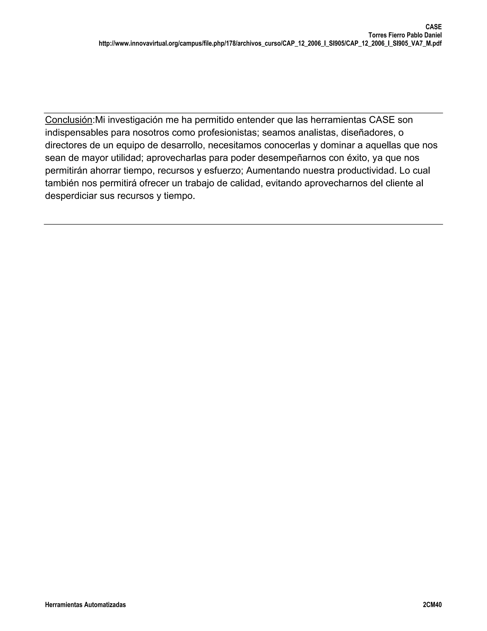 Este documento define CASE (Ingeniería de Software Asistida por Computadora) como una metodología que ayuda a los desarrolladores de software mediante herramientas que automatizan partes del proceso de desarrollo. El objetivo es mejorar la calidad y aumentar la productividad al reducir tiempos. Las herramientas CASE permiten centrarse en el análisis y diseño, y reducen errores. Pueden ser herramientas individuales o trabajar juntas. La portabilidad es fundamental. Las herramientas crean modelos, componentes,