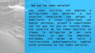 El documento explica qué son las redes sociales, cómo sirven y cuáles son las más populares. Define las redes sociales como páginas o aplicaciones que permiten a los usuarios conectarse con amigos, familiares u otros grupos. Explica que las redes sociales más usadas son Facebook, YouTube, Qzone e Instagram.