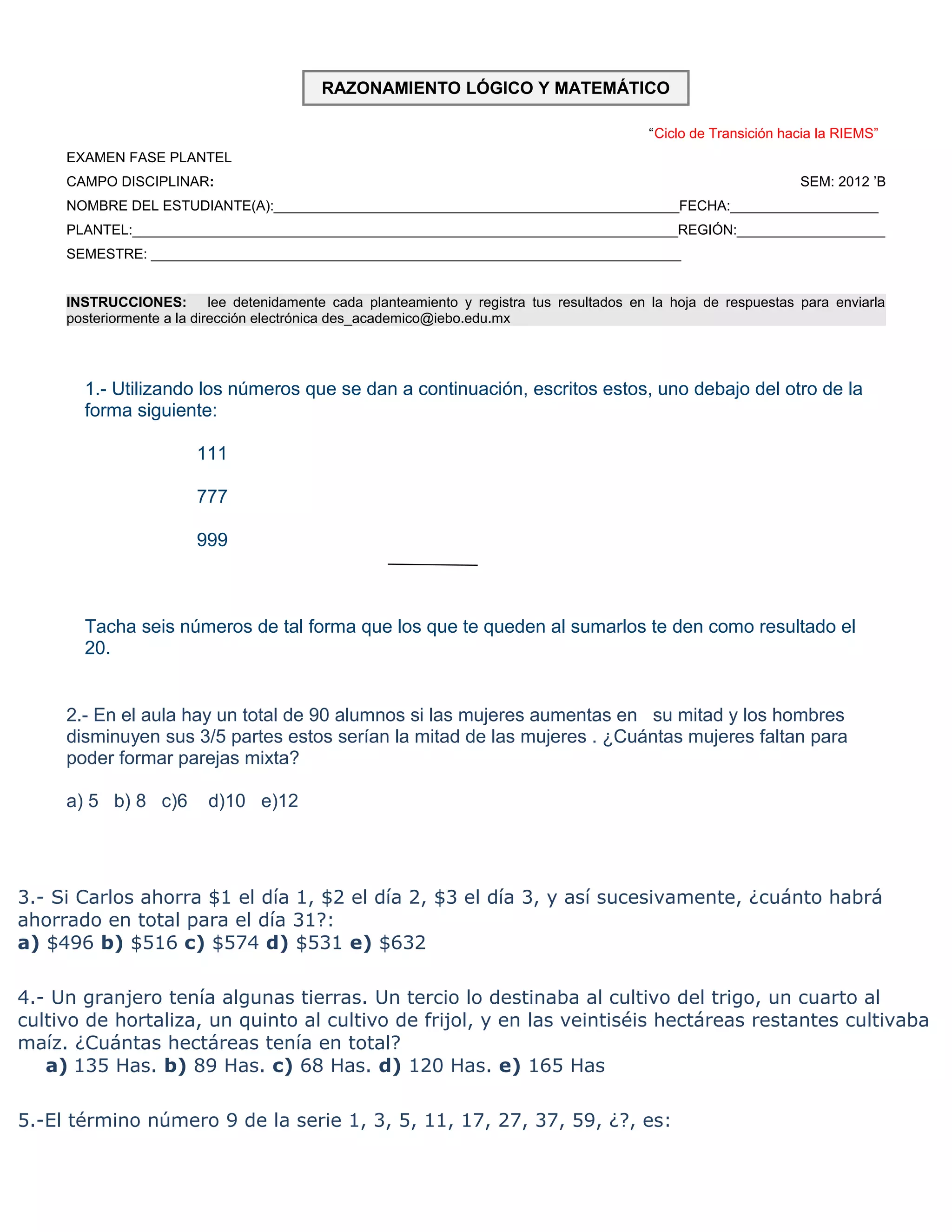 Este documento presenta 17 problemas de razonamiento lógico y matemático. Los problemas incluyen tareas como tachar números para obtener un resultado específico, calcular cantidades ahorradas con un patrón de incrementos diarios, resolver ecuaciones cuadráticas, y encontrar el número de triángulos posibles con vértices dados. El documento proporciona una serie de preguntas para evaluar la comprensión y habilidades matemáticas y lógicas de quien lo resuelve.