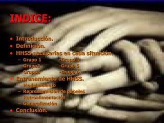 Este documento describe las habilidades sociales y cómo pueden entrenarse. Explica que las habilidades sociales son conductas que permiten relacionarse de manera efectiva con los demás. Luego describe seis grupos de habilidades sociales específicas y cuatro componentes clave para entrenarlas: modelamiento, representación de roles, retroalimentación y generalización. El objetivo final es que las personas apliquen estas habilidades en la vida real de manera estable.