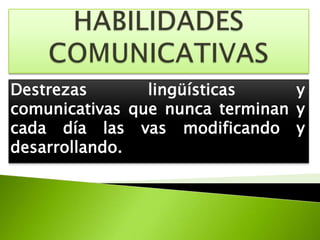 Este documento describe cuatro habilidades comunicativas fundamentales: escuchar, hablar, escribir y leer. Explica que estas destrezas lingüísticas y comunicativas se van modificando y desarrollando constantemente y permiten comprender información a través de sonidos, producir discursos verbales en diferentes contextos, escribir textos considerando necesidades y contextos, e interpretar lo que otros han escrito. Además, señala que las competencias comunicativas se centran en dominar estas cuatro habilidades aunque el ICFES evalúa principal